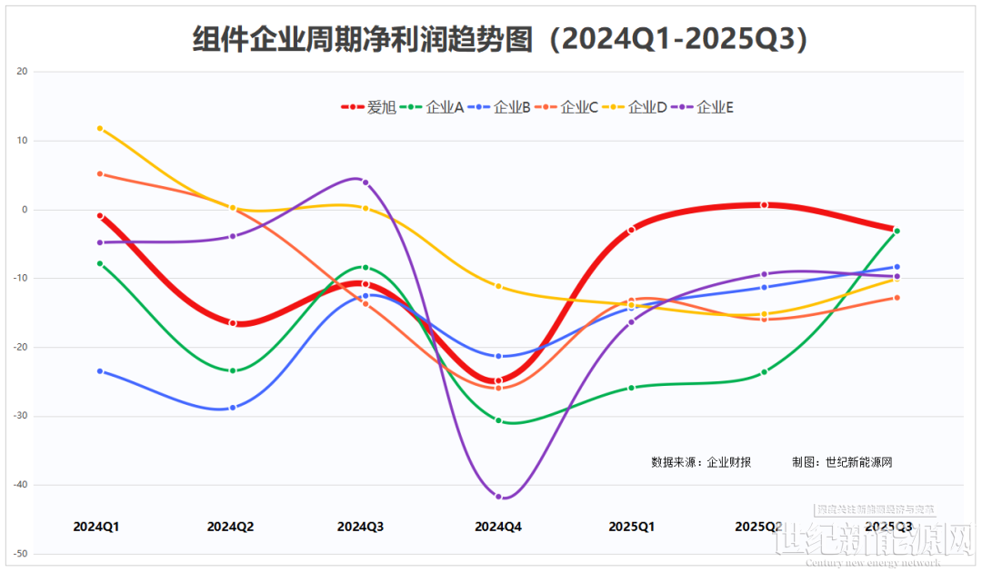 世紀新能源網對6家上市組件頭部企業的2024Q1-2025Q3凈利潤數據進行搜集整理,可以看出愛旭自2024年Q4起,開始“觸底”反彈,2025年Q2,更是以6286.49萬的凈利潤“回正”,成為2024Q4以來,頭部組件企業中唯一一家凈利潤為正數的企業。