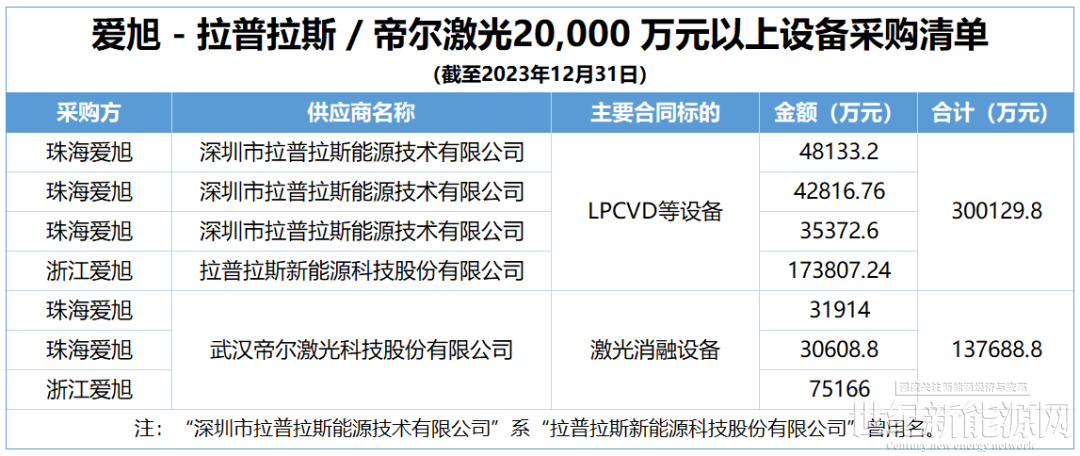 據北京國楓律師事務所出具愛旭定增補充意見書披露,截至2023年12月31日,愛旭20,000萬元以上的重大設備采購合同、訂單數據顯示,帝爾激光進賬13.77億元,拉普拉斯進賬30.01億元。